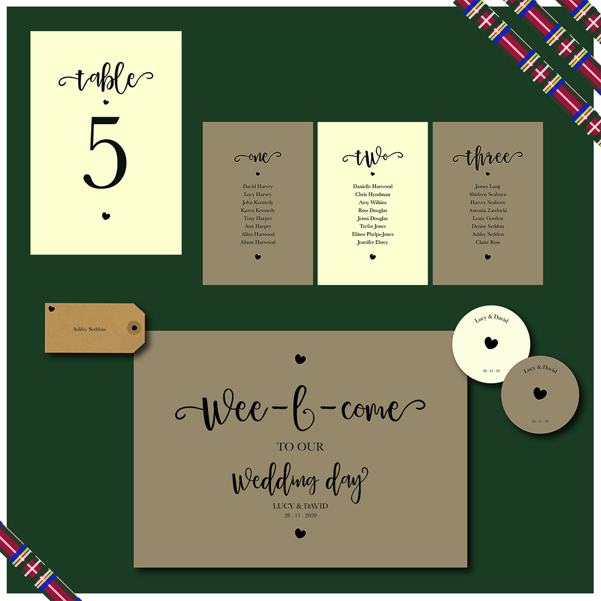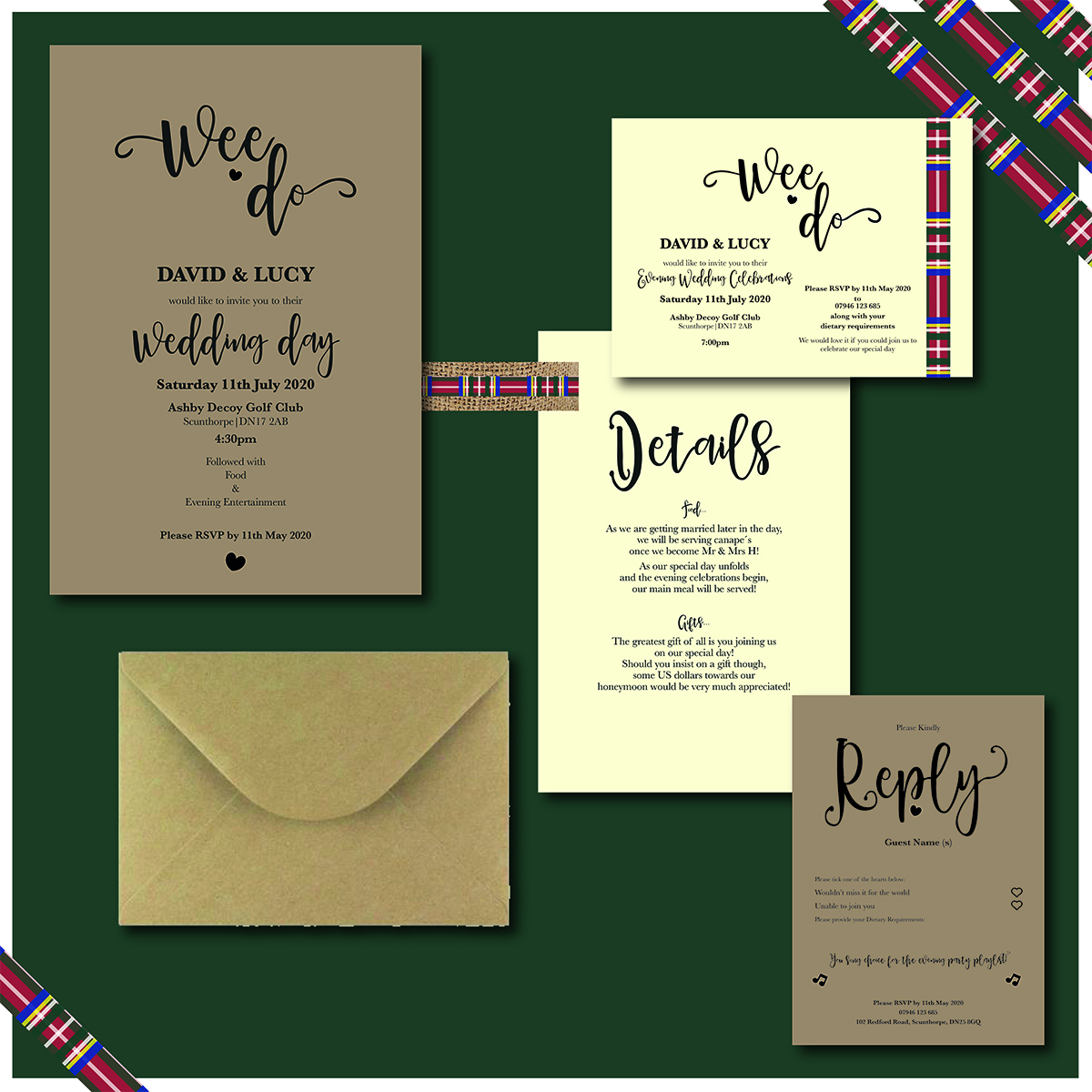 This quirky collection was put together and inspired from the ideas by a wonderful couple of mine, who wished to incorporate their Scottish Tartan in their design! Envelope liners with ribbon and hessian belly bands, why not incorporate your family tartan in your stationery too!
